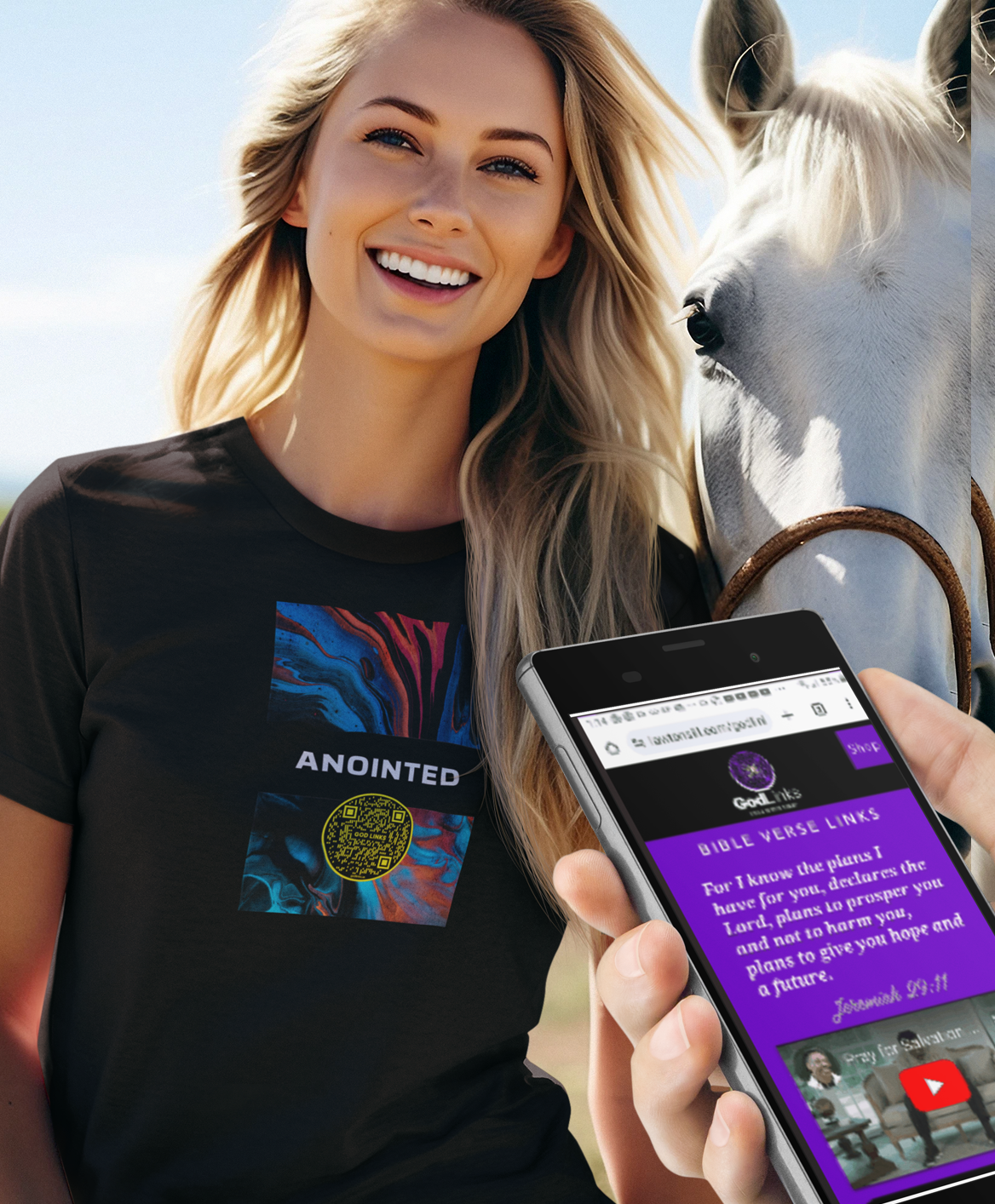 Every GodLinks shirt we design has a unique QR code printed within the design. When scanned with a smartphone, the user will be linked to our interactive, GodLinks Bible verse page instantly on their phone! Here you’ll be able to enjoy a different bible verse each time you scan, watch our monthly video links and visit over thirty different Christian Podcasts. We are adding new links all the time so our supporters will be able to enjoy a new array of content throughout the years.