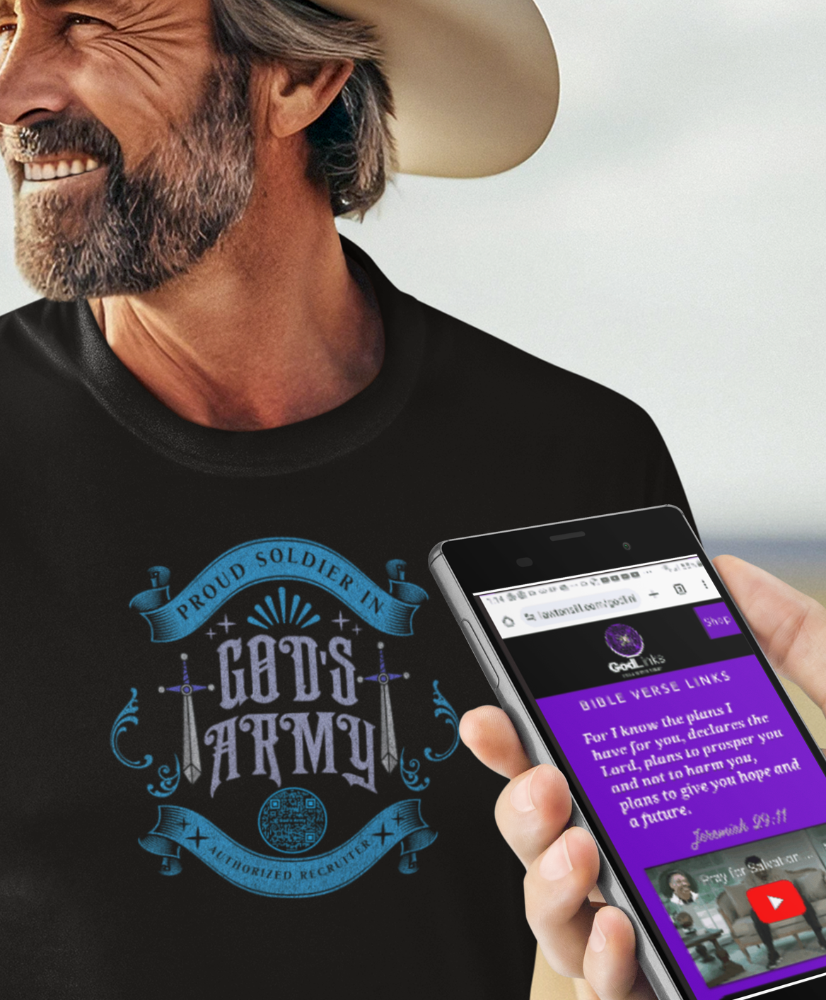 Every GodLinks shirt we design has a unique QR code printed within the design. When scanned with a smartphone, the user will be linked to our interactive, GodLinks Bible verse page instantly on their phone! Here you’ll be able to enjoy a different bible verse each time you scan, watch our monthly video links and visit over thirty different Christian Podcasts. We are adding new links all the time so our supporters will be able to enjoy a new array of content throughout the years.