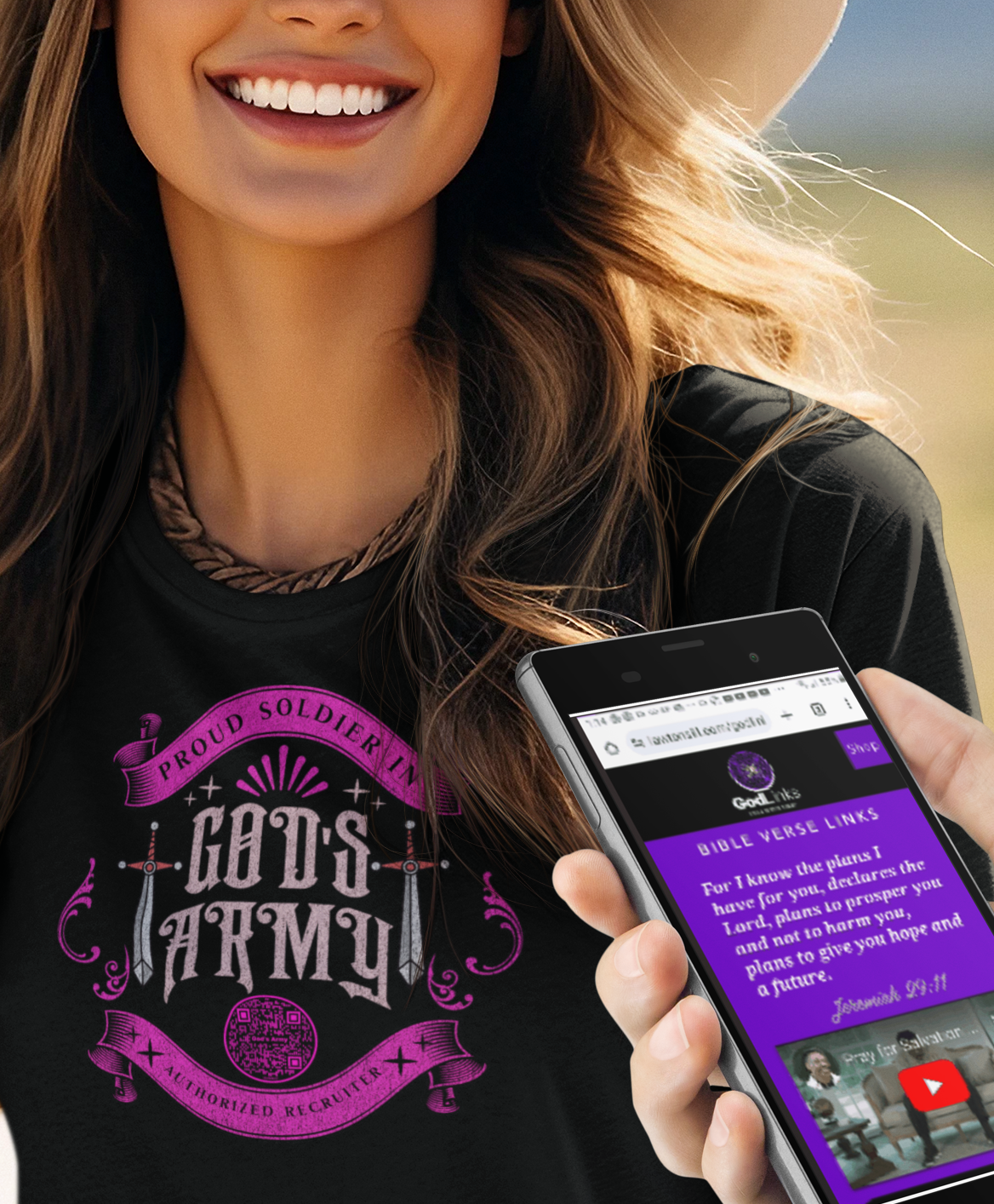 Every GodLinks shirt we design has a unique QR code printed within the design. When scanned with a smartphone, the user will be linked to our interactive, GodLinks Bible verse page instantly on their phone! Here you’ll be able to enjoy a different bible verse each time you scan, watch our monthly video links and visit over thirty different Christian Podcasts. We are adding new links all the time so our supporters will be able to enjoy a new array of content throughout the years.