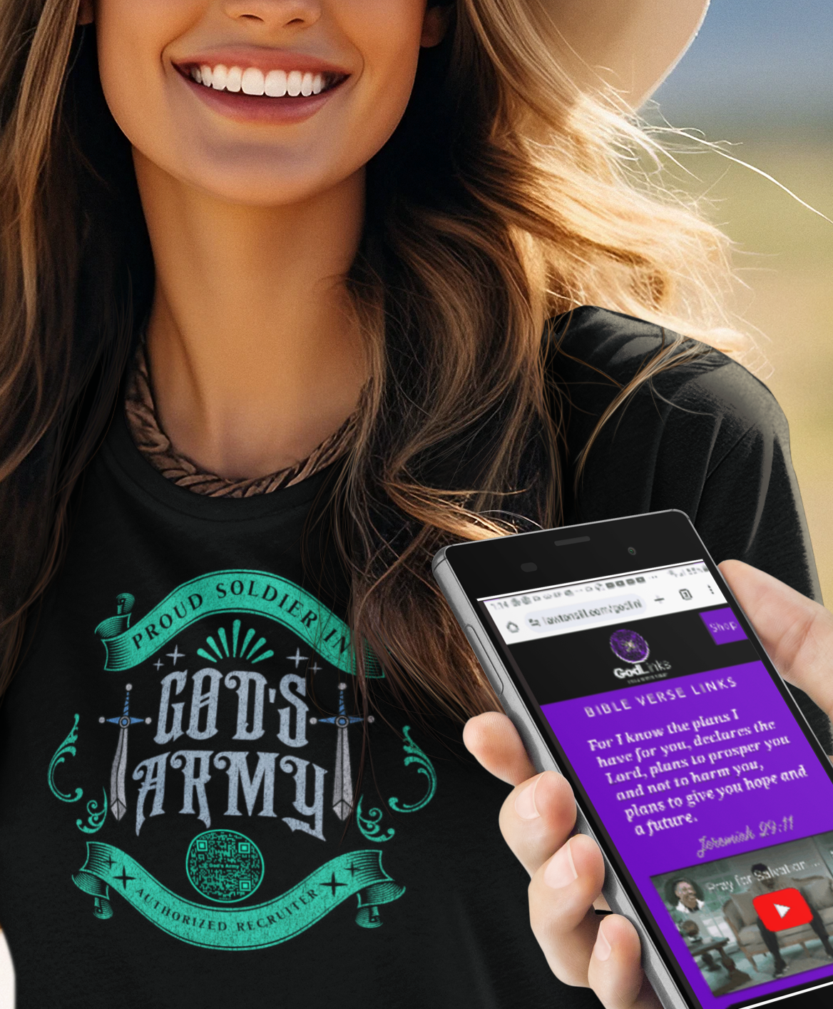 Every GodLinks shirt we design has a unique QR code printed within the design. When scanned with a smartphone, the user will be linked to our interactive, GodLinks Bible verse page instantly on their phone! Here you’ll be able to enjoy a different bible verse each time you scan, watch our monthly video links and visit over thirty different Christian Podcasts. We are adding new links all the time so our supporters will be able to enjoy a new array of content throughout the years.