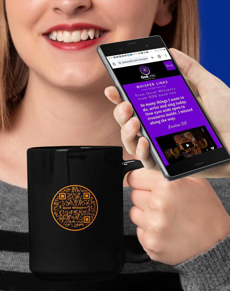 Every GodLinks mug we design has a unique QR code printed on it, when scanned with a smartphone, the user will be led to an uplifting, online scrolling presentation of excerpts from the book the book "Quiet Whispers from God" instantly on their phone!