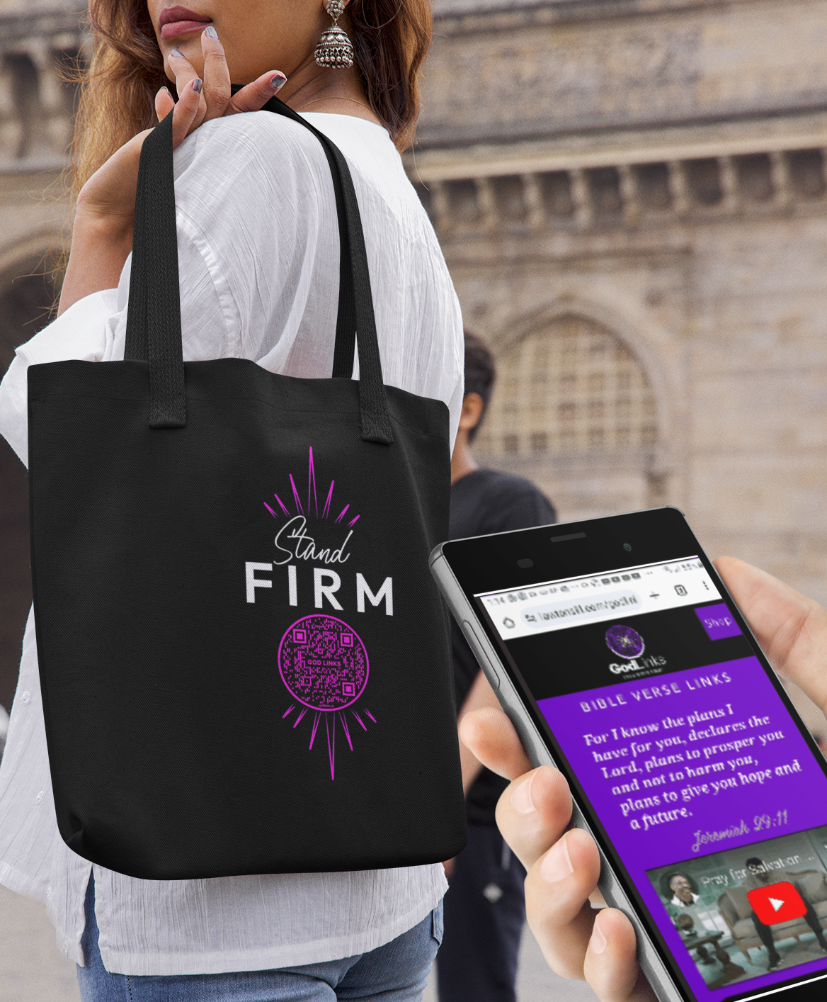 Every GodLinks tote we design has a unique QR code printed within the design. When scanned with a smartphone, the user will be linked to our interactive, GodLinks Bible verse page instantly on their phone! Here you’ll be able to enjoy a different bible verse each time you scan, watch our monthly video links and visit over thirty different Christian Podcasts. We are adding new links all the time so our supporters will be able to enjoy a new array of content throughout the years.